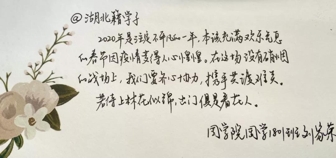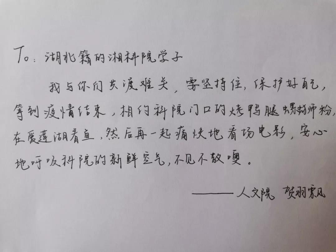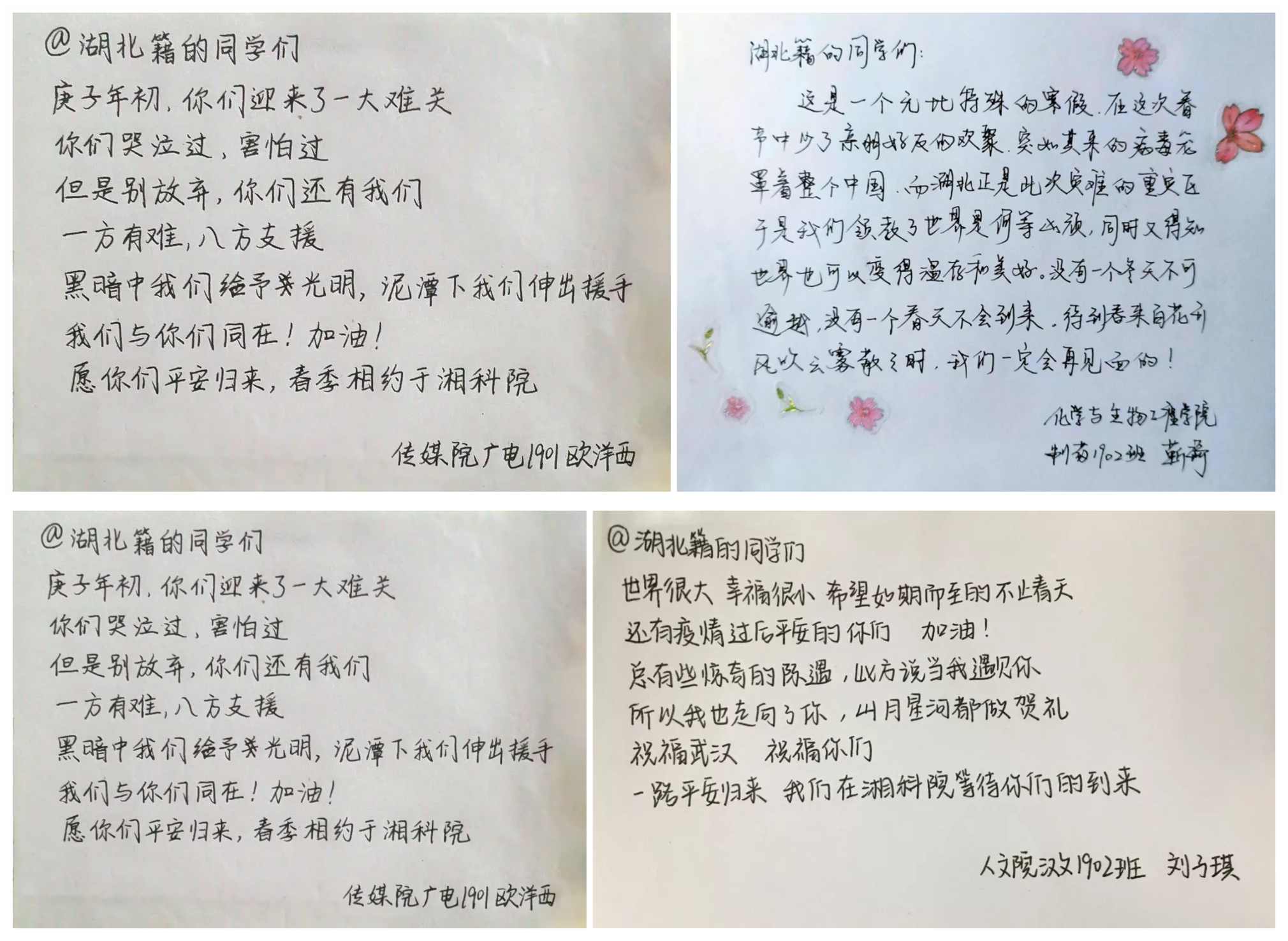本网讯  “世界很大,幸福很小,希望如期而至的不止春天,还有平安的你们。”“远在千里的你们不会孤单,我们牵挂着你们,等待着你们平安相聚。”连日来,学校师生心系湖北籍的同学们,用书信架起爱的桥梁,用文字传递爱的力量。