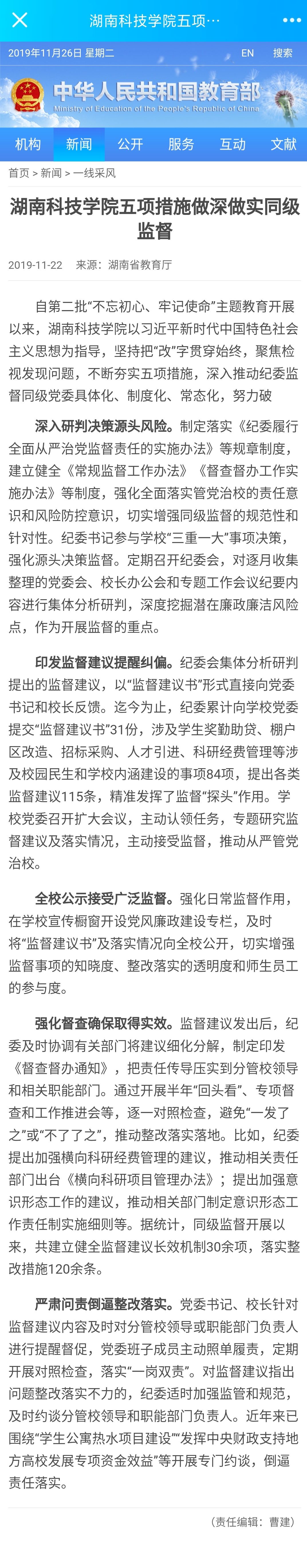 本网讯 11月22日,教育部官网以“星空app官网五项措施做深做实同级监督”为题,推介我校做深做实同级监督工作经验。