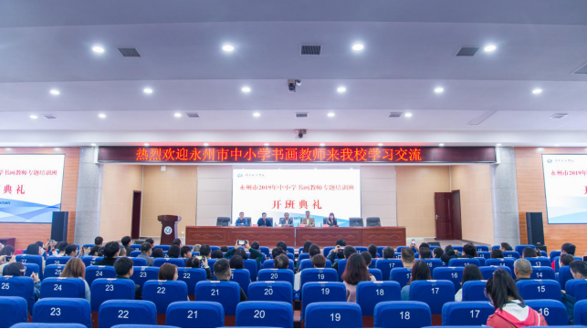 本网讯 10月23日—25日,2019年永州市中小学书画教师专题培训班在我校举行,来自全市11个县(区)和市直属校的200多名中小学书画教师参加培训。副校长郑山明、永州市教师发展中心主任唐作明、继续教育学院负责人等参加开班仪式。
