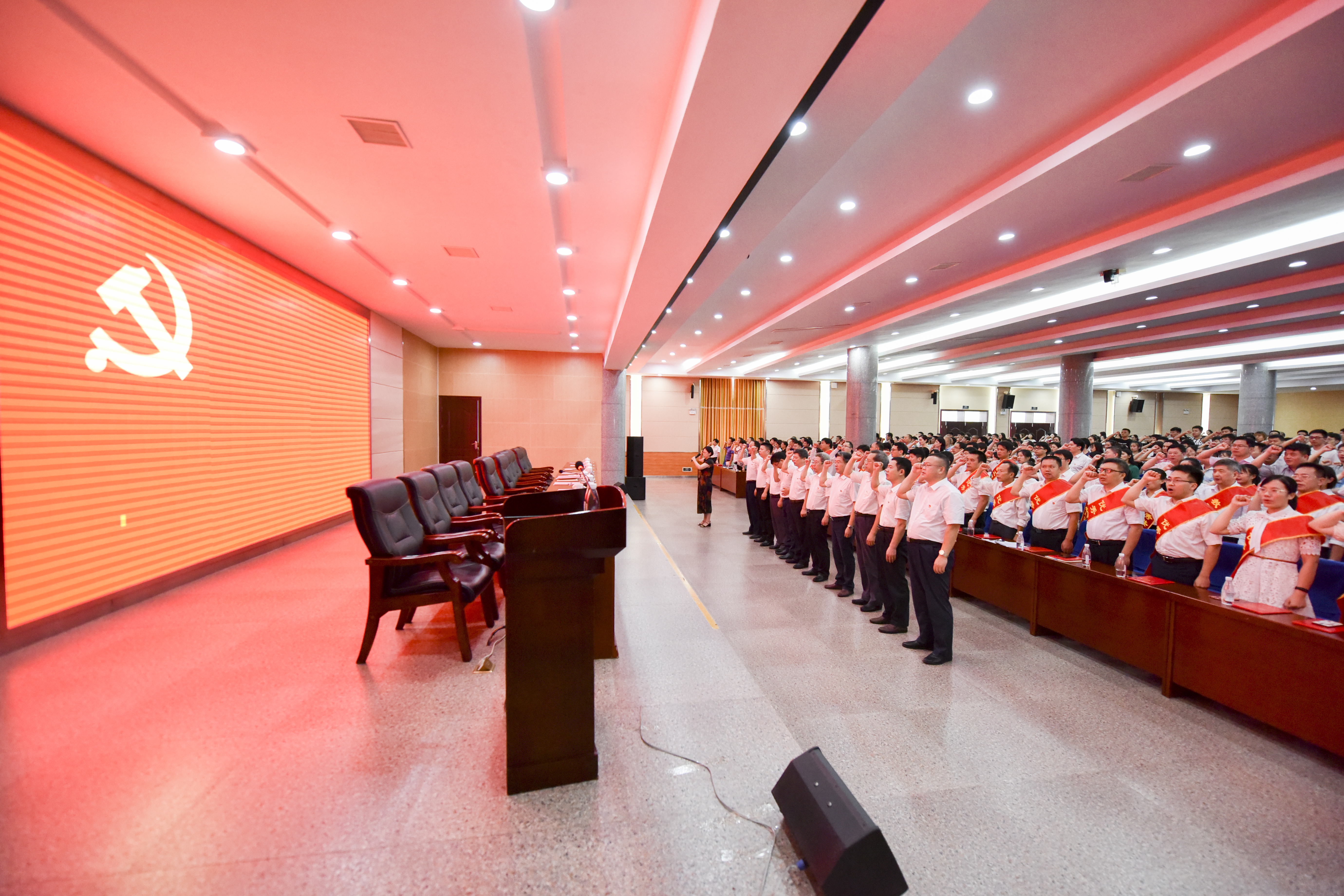 全体与会党员面对鲜艳党旗,一起重温了入党誓词。