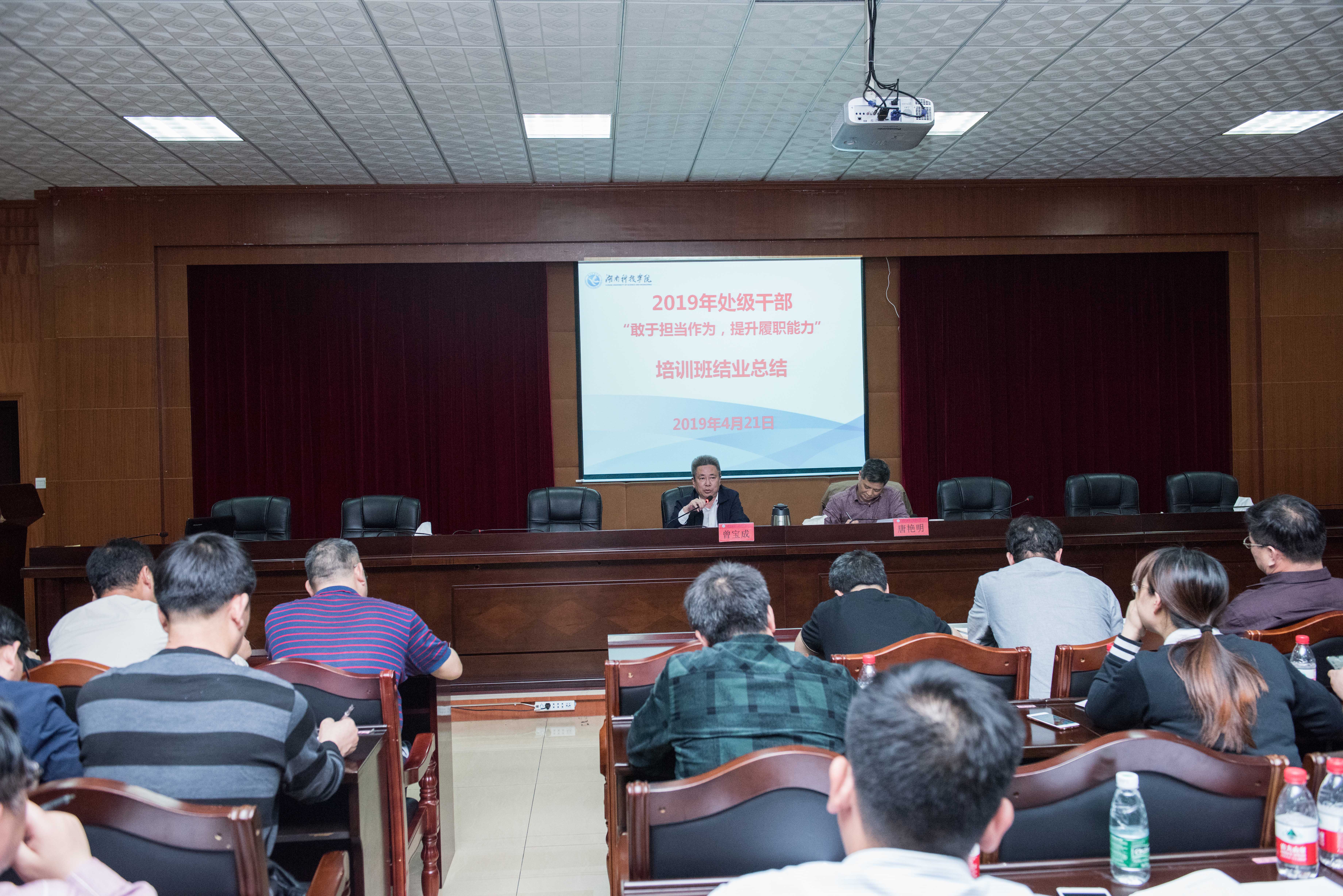此次处级干部培训班,是学校在深入学习贯彻党的十九大精神和习近平新时代中国特色社会主义思想,全面推进区域性高水平应用型大学建设,中层干部部分调整后进入新的履职任期等背景下举办的。以知识测试、辅导报告、体验式培训、交流发言、撰写心得体会相结合的方式开展。共安排8场专题讲座,分别由校领导曾宝成、唐艳明、彭立威作专题辅导,由党委委员、组织部长何福林,校友办主任杨能山,著名管理培训专家刘启正作专题报告。全体学员参加了主题为“掌握管理原理,提升执行能力”的体验式培训。学员还结合学习情况,紧密联系各自工作,谈体会、讲思路、议发展,气氛融洽热烈。王瑛、曾二青,刘小文、尹向东、周玉华、周芳检,谷利民、谭德修、高树琴分别作主题为“担当作为,提升执行力”“学院教学与学科建设”“管理服务工作”的主题发言。