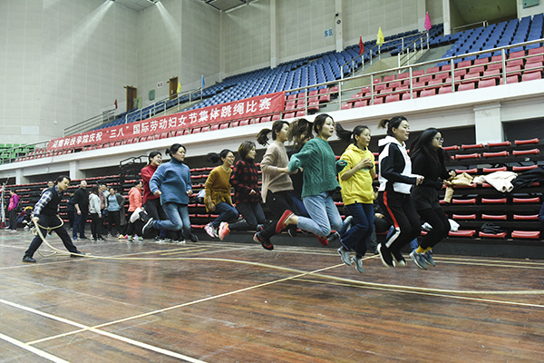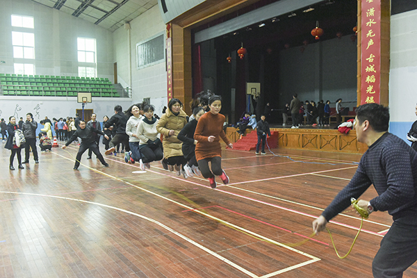 本网讯   3月8日下午,为庆祝“三八”国际妇女节,丰富我校女教职工的业余生活,我校以健康为中心,以活动为纽带,在体育馆举行教职工跳绳比赛。校党委副书记、工会主席唐艳明在现场为职工们加油助威。
