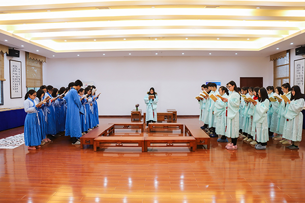 晨读过后,张京华教授和周建刚研究员来到小成堂与同学们一起进行开学“相见礼”,张京华、周建刚以及国学精英班的学子们双手合抱端拱举于胸前,一齐俯身揖拜,并向国学学子们致以诚挚的新学期问候。学生易绍虎说道,学院通过行师生相见礼的方式打开新学期的第一课,同学们穿着汉服其乐融融聚在一起晨读、行礼,很符合学院的学术氛围,也加深了同学们之间的情谊。