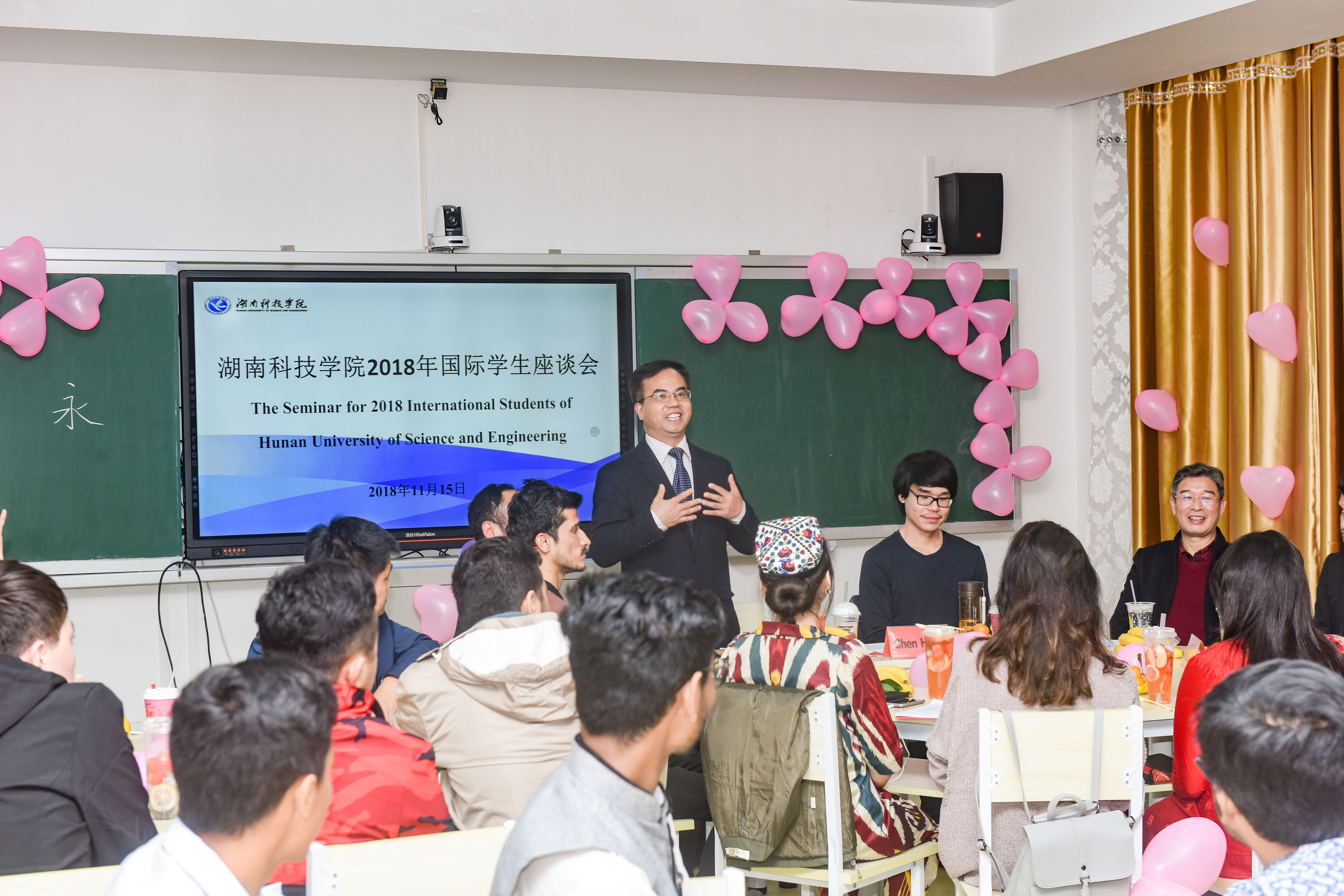 在大家畅所欲言之后,陈弘起身用英语向大家致以热情的问候,并与他们亲切地交流。他表示学校把大家当成自己的亲人,尽最大努力为大家提供优质贴心的服务,让大家在这里快乐地学习,健康地生活。就国际学生的学习生活,他分享了自己的经验和建议:一是在学习语言时不能害羞,要大胆地说,多开口讲,多用汉语多交朋友,一定会有收获与进步;二是生活上遇到困难,学校一定会妥善予以解决,要遵纪守法,记住老师的告诫,任何时候都要防止受到意外伤害,你们的安全是学校最大的牵挂;三是学习上学校将按大家的需求,为大家学习书法、戏剧、古典诗词等中国传统文化提供机会。他希望大家要注重体育锻炼,学习之余要参加多样的文体活动,既要学习好,也要身体棒。最后他勉励大家,尽管我们来自不同的国家,但人类命运共同体的理念使我们联系紧密,亲如一家。
