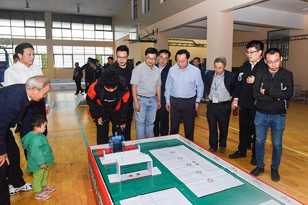 本网讯  10月18日下午,市委副书记、市长赵应云来校调研,现场调度2018“猎豹汽车”杯首届中国青少年人工智能机器人大赛暨第九届亚洲机器人锦标赛VEX中国选拔赛的筹备工作,市政府秘书长陈宇荣,校长曾宝成、副校长宋宏福陪同。