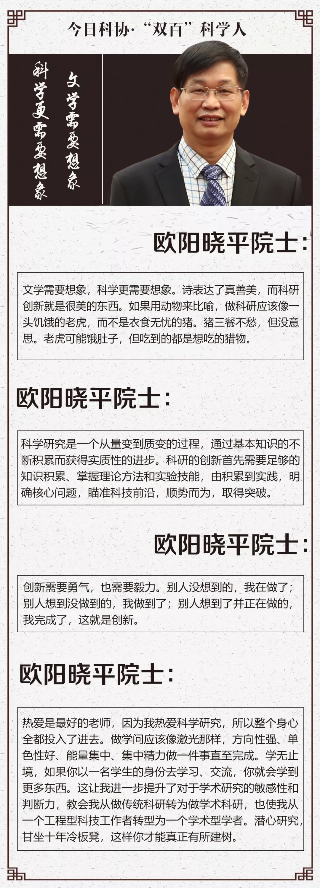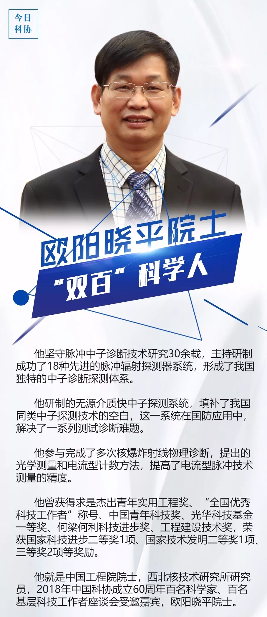 本网讯   近日,《今日科协》策划推出《图说“双百”科学人》栏目,推介一批受邀参加中国科协成立60周年百名科学家、百名基层科技工作者座谈会的“双百”科学人。该栏目以《欧阳晓平院士:坚守脉冲中子诊断技术研究30余载》为题,对我校名誉校长、杰出校友、中国工程院院士欧阳晓平进行了推介报道,现将全文予以转载。