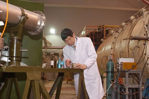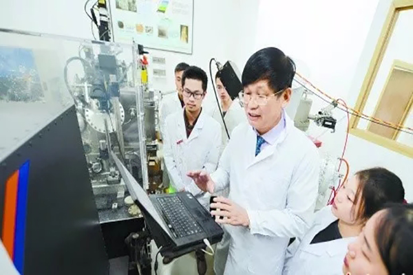 欧阳晓平院士(中)带领学生进行大面积薄膜脉冲激光沉淀系统相关实验