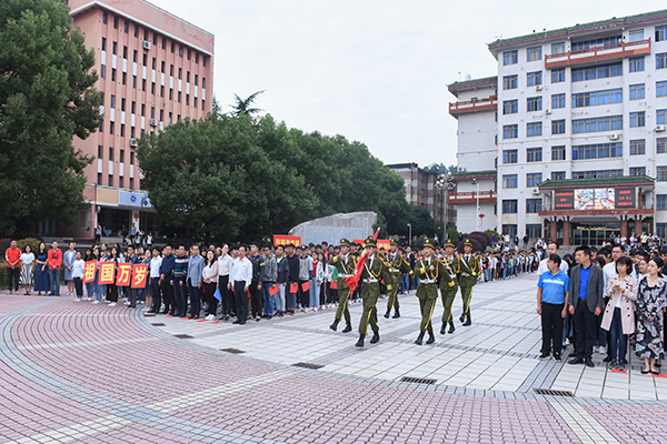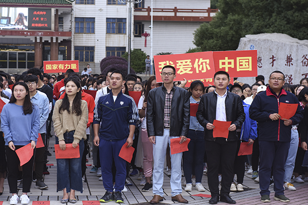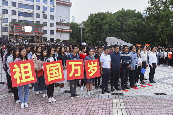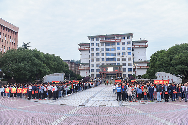 本网讯   10月1日早上7时许,迎着初升的朝阳,鲜艳的五星红旗伴随着庄严的国歌声冉冉升起,全体师生肃立行注目礼,校党委书记陈弘与全场1500余名师生齐声高唱国歌,衷心祝福祖国繁荣昌盛,为伟大祖国喝彩。