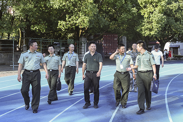 本网讯  9月20日下午,省军训工作检查小组成员尚国华中校,省军区军训办参谋胡涛,永州军分区战备建设处处长张玉龙上校,零陵区武装部政委孙国颖上校以及市教育局相关人员来校检查指导军训工作,副校长程智开陪同参加。