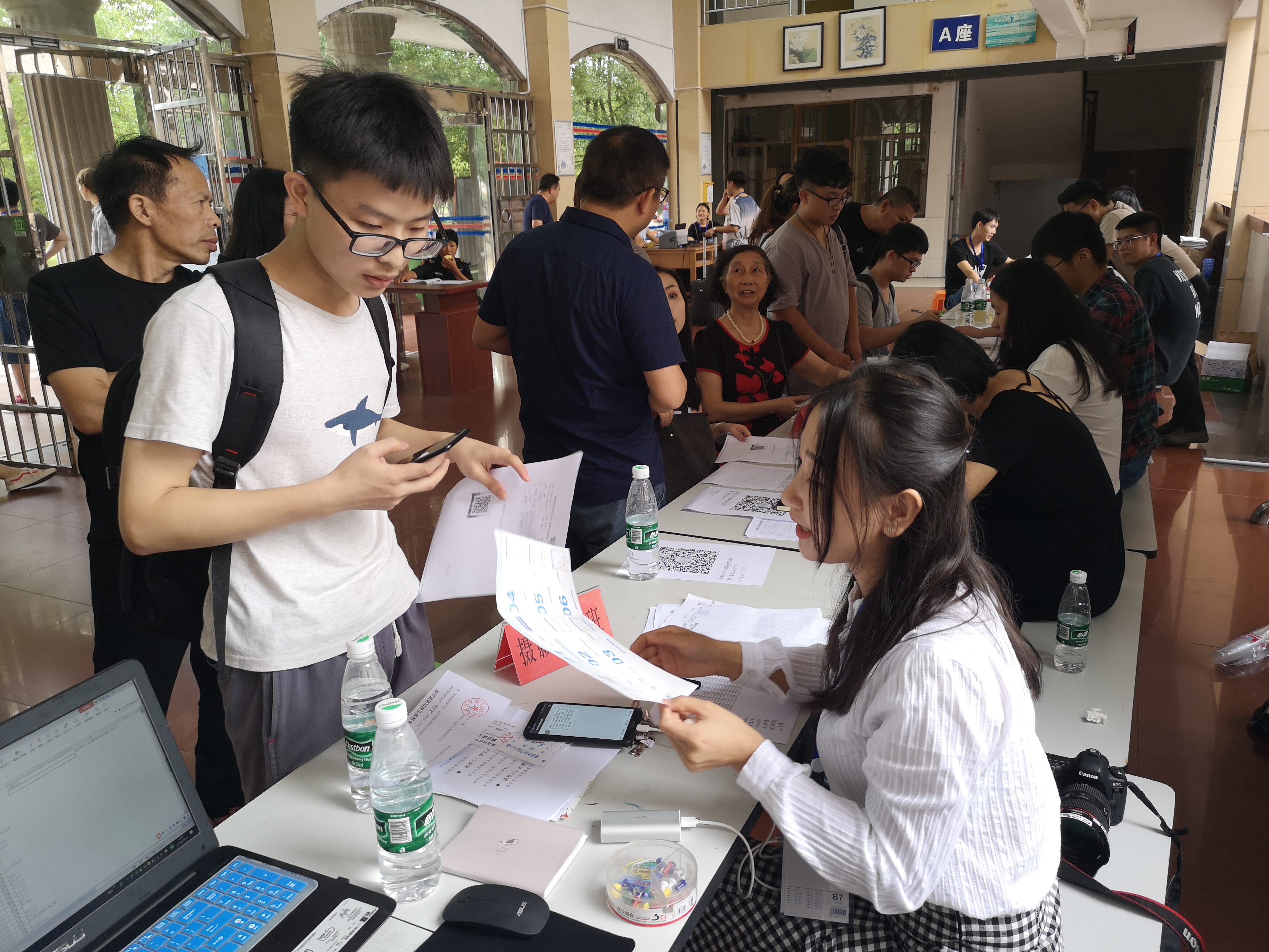 在迎新工作中,有这样一只队伍,他们亲切可人,默默工作,使每一位新生都能顺利报到,他们就是副班。副班们始终坚守在自己的岗位上,重复着同样的言语,耐心地为同学介绍政策、办理手续。晚上十点多,国贸1802班的副班杨万申仍值守在报到处,怕晚上来的学生不能顺利报到。他说,新生、家长们刚来学校什么都不知道,看到家长脸上有疑虑时就应该主动询问,帮他们解决问题,他们的每一句谢谢都是我最大的动力。