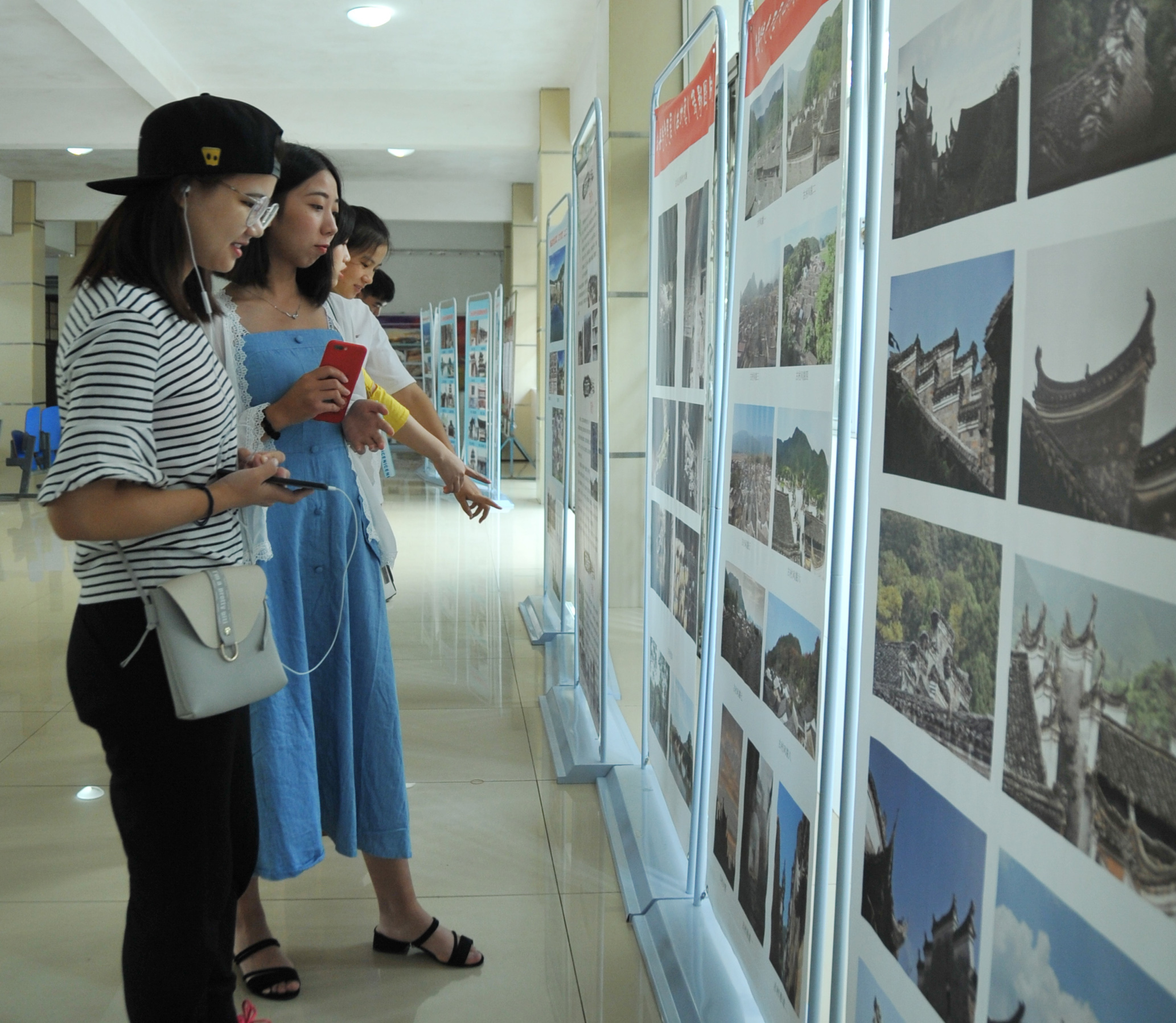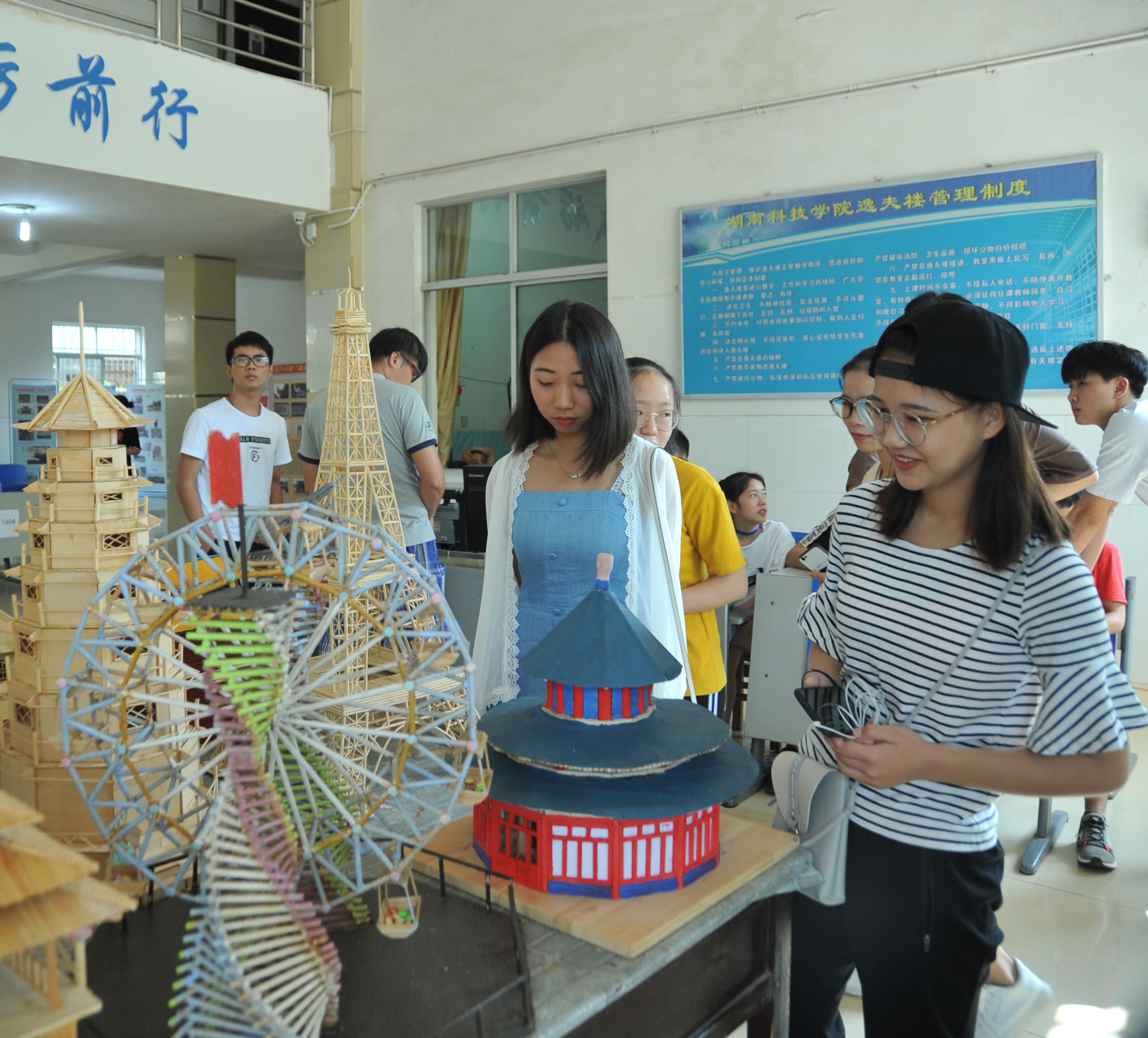 简单木材做成的小型埃菲尔铁塔、天坛和侗族特色榫卯结构突出的风雨桥等建筑模型,其做工精巧和极具美感的视觉效果引得许多新生和家长的驻足。在这些令人惊奇的木制小型建筑模型后,同时能够看到永州市特色古村落的剪影展示,这是土环学院送给新生的见面礼。“这些建筑模型都是我们城乡建设与古建筑保护协会在开展木结构大赛时,参赛者们耗时一个半月的优秀作品,展示出来是为了让新生了解我们的学院特色。”来自土木1602班的谭彬介绍,“同时展出的古村落剪影,是在进行下乡测绘时拍摄的,希望通过图片吸引更多人加入传播保护古建筑的队伍中来。”