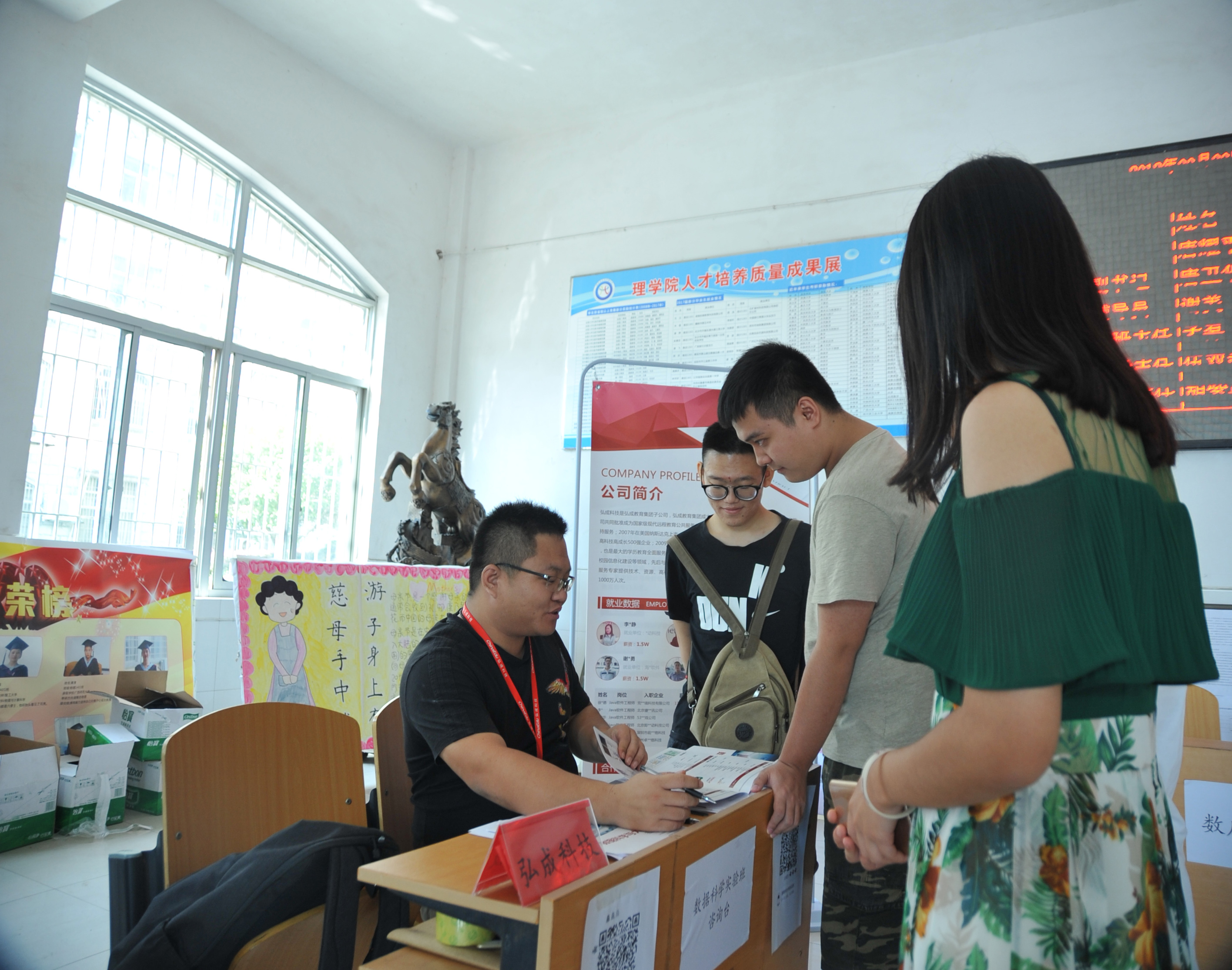 在明理楼大厅,理学院的数据科学与大数据技术实验班咨询处吸引了不少新生和家长。这是该院今年开始即将启动的校企合作培养项目,与弘成科技发展有限公司推出数据科学与大数据技术方向培养计划,该方向侧重学生就业,主要培养信息技术和数据挖掘、人工智能中的实际问题的高级专门人才。学生在大学期间所有专业课都由企业技术专家授课和训练,采用最新的专业教材,真正实现了学校与企业用人需求的无缝对接。很多学生及学生家长在新生接待处进行了咨询,向企业方代表了解专业特色、班级优势、就业优势及课程具体安排。