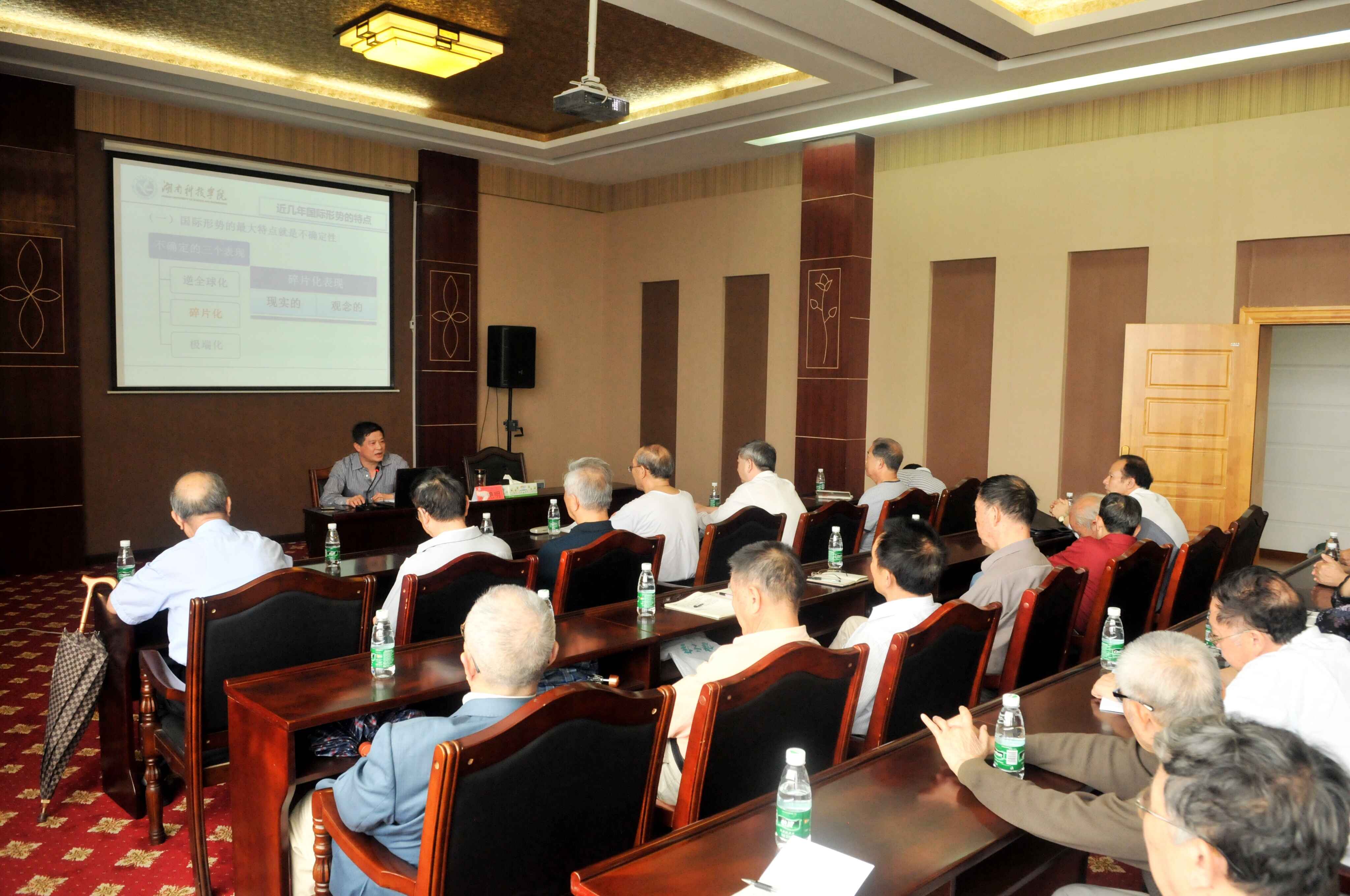 本网讯 为深入学习贯彻习近平新时代中国特色社会主义思想和十九大精神,6月6日下午,党委副书记唐艳明以“当前国际形势的特点和十九大以后的中国外交关系”为题,为我校离退休同志作形势辅导报告。报告会由离退休工作处处长刘剑非主持,50余名离退休同志参加会议。
