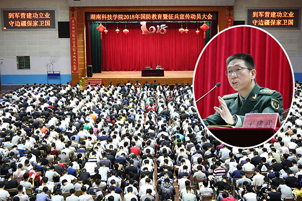 本网讯  4月3日晚,为贯彻落实习近平总书记强军思想以及4月3日上午在京召开的2018年全国大学生征兵工作网络视频会议精神,学校组织4000余名适龄男青年举行国防教育暨征兵宣传动员大会。零陵区武装部部长王建武作征兵宣传动员工作报告,副校长程智开出席。