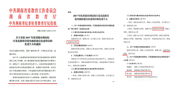 本网讯  近日,中共湖南省委教育工作委员会、湖南省教育厅、中共湖南省纪委驻省教育厅纪检组下发了《关于表彰2017年度省属本科院校厅委直属单位党风廉政建设先进单位和先进个人的通报》(湘教工委通[2018]13号),我校荣获“落实党风廉政建设党委主体责任先进单位”、“落实党风廉政建设纪委监督责任先进单位(二等奖)”、“执纪审查先进单位”等三项集体荣誉,纪委书记彭立威获“执纪审查先进个人”称号。