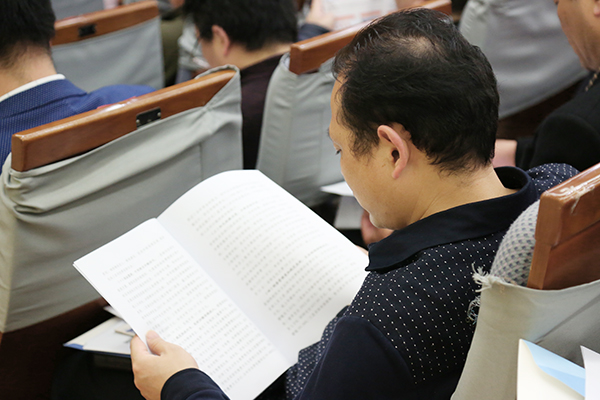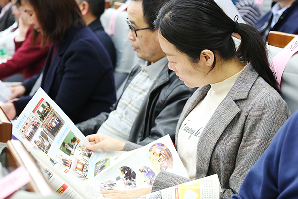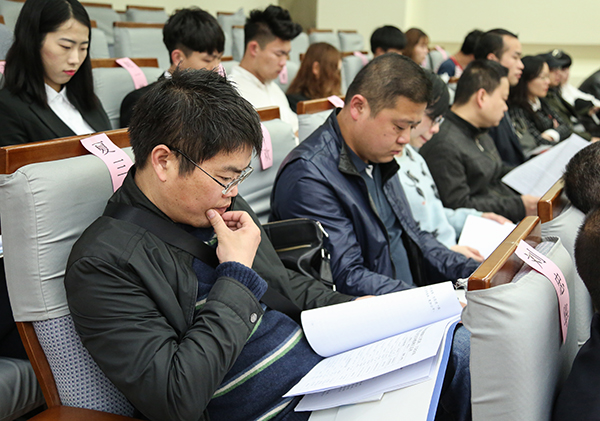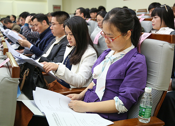 3月31日早上7:35,工作人员早早地到达会场,整理摆放在代表座位上的资料。