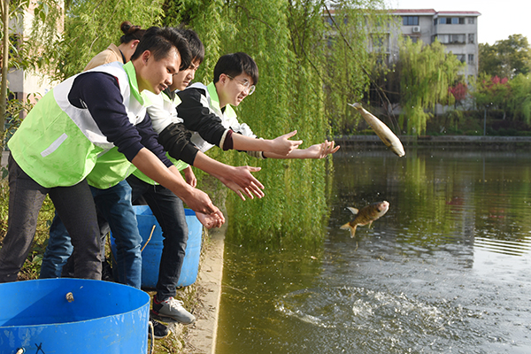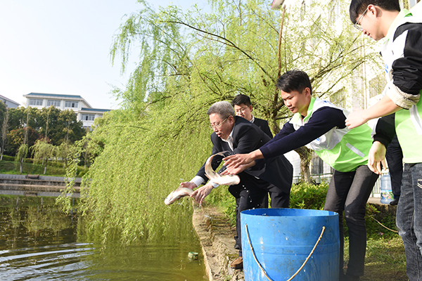 本网讯 今年3月22日是第26届世界水日,也是第31个中国水周首日。“关注水资源,放鱼护生态”2018 世界水日主题放鱼活动在学校人工湖举行。校长曾宝成带领师生志愿者参加活动。