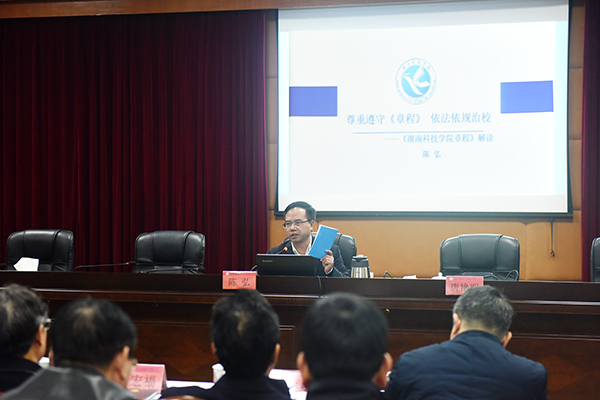 本网讯 12月13日晚,党委书记陈弘以“尊重遵守《章程》 依法依规治校”为主题为第四届教职工代表、工会会员代表进行专题培训,对《星空app官网章程》作全面深入地讲解分析。党委副书记唐艳明主持。