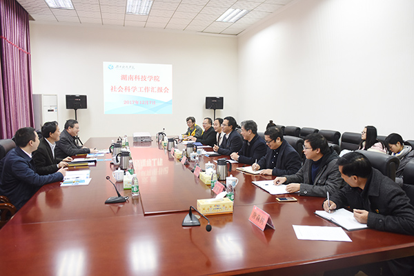 本网讯 12月7日上午,湖南省社科联党组书记、副主席宋智富来校调研,听取了校党委书记陈弘关于我校社科工作的专题汇报,并就我校社科工作提出指导意见。副校长宋宏福、永州市社科联主席陈水恩及学校人文社科相关人员参加汇报会。