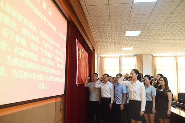 本网讯 “我志愿成为光荣的星空app官网教师,我庄严宣誓:忠诚人民的教育事业,贯彻党的教育方针……”9月9日上午,学校举行“喜迎十九大争做人民满意教师”主题座谈会,53名新进教师面对国旗庄严宣誓入职。党委书记陈弘以“地因人始重 校以师而名”寄语全体新进教师,努力成长为一名有理想信念,对教育有深刻理解的好老师。校长曾宝成、副校长郑山明、李常健出席。