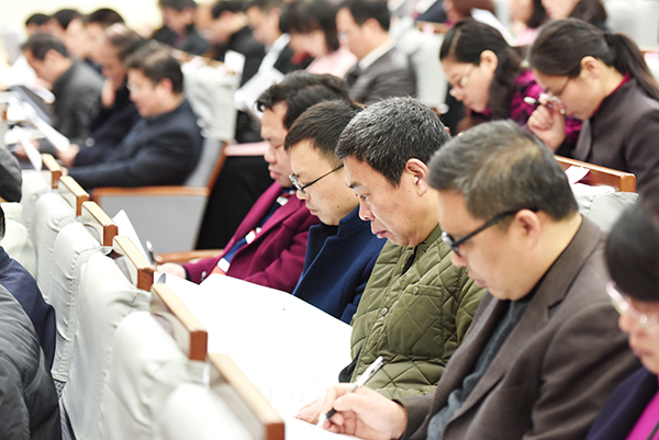 本网讯 春意盎然万物苏。3月11日上午,我校第四届教职工代表暨工会会员代表大会第四次会议在尚美楼二楼演播厅开幕。两百余名会议代表、特邀嘉宾、列席代表齐聚一堂,同商改革大计,共绘发展蓝图。主席团成员、校长曾宝成作题为《聚焦重点短板,持续精准发力,为加快推进“双一流”建设而努力奋斗》的工作报告。会议由主席团成员、校党委副书记唐艳明主持。