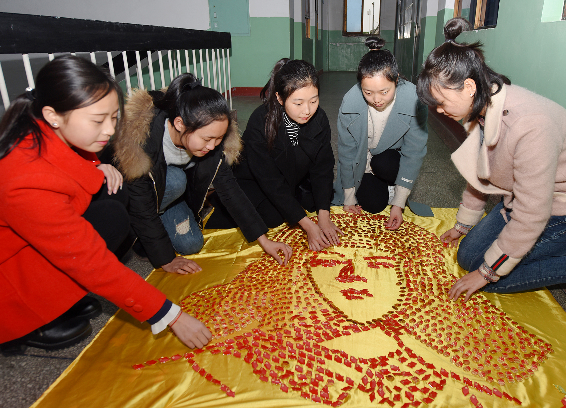 这幅雷锋画像作品由人文学院学生历时一周创作完成。党徽和团徽在金黄的衬面上精心布局,排列整齐,立体感非常强。这幅构思新颖、形式创新、意见非凡的“手绘”作品以崭新的表现形式再现雷锋同志光辉形象,向“两会”和雷锋纪念日献礼。
