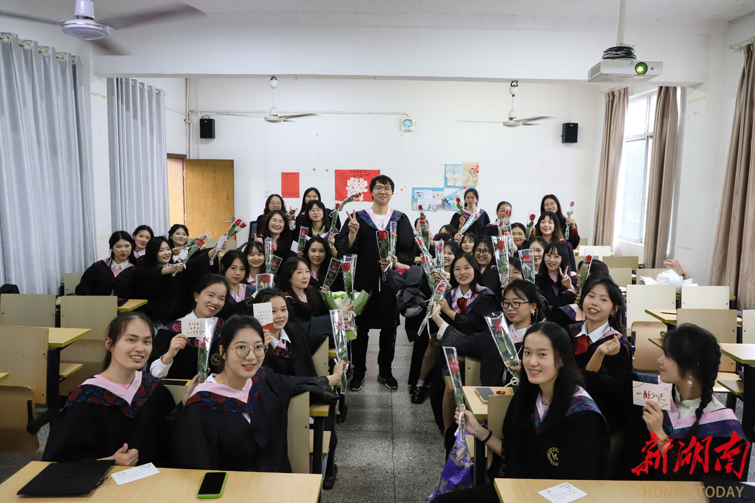 “很幸运我的大学四年遇见了你们,谢谢你们的关照和陪伴!希望毕业后,你们要好好照顾自己!”5月20日下午,星空app官网外国语学院英语师范专业2001班的40名女生,收到了一份特别的毕业礼物——精心准备的花束和手写祝福卡片。送出这份走心毕业礼物的,正是全班唯一的男生,李悟。