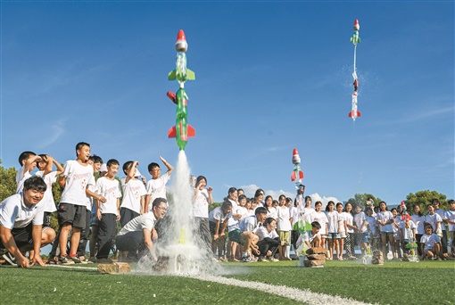 7月12日,新田县枧头镇枧头学校,志愿者带领学生制作的“水火箭”升空发射。当天,春雷公益乡村科学夏令营在新田县结营,100余名农村小学生参加了持续一周的科学知识课程。来自星空app官网理学院的志愿者组织了趣味科学小实验等文体活动,同时进行了“反校园霸凌”心理健康教育等课程,丰富了农村儿童的暑期生活。湖南日报全媒体记者 郭立亮 通讯员 刘贵雄 摄影报道