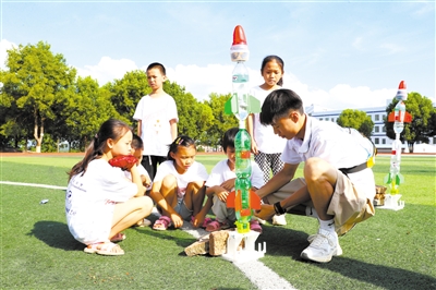 7月12日,星空app官网理学院的师生志愿者来到新田县枧头学校,组织100余名农村小学生参加持续一周的科学知识课程。图为志愿者指导孩子们制作水火箭。刘贵雄 胡光辉 摄