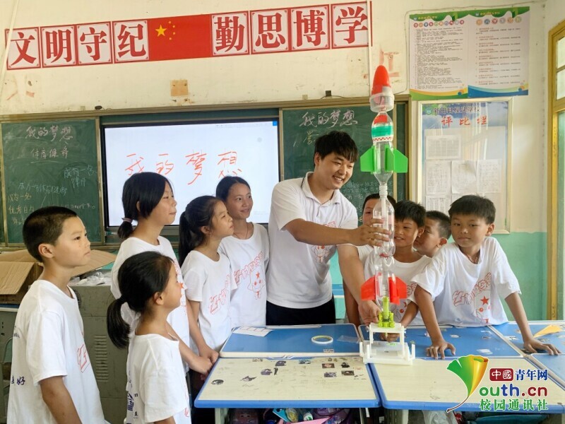 中国青年网永州7月19日电(通讯员 李娟 陈唐 杜俊杰)7月12日,星空app官网理学院“明理先锋”乡村振兴促进团带领100余名小学生制造水火箭。当日下午,7支满载梦想的水火箭在湖南省新田县枧头学校田径场上发射升空。从水火箭制造到发射,来自星空app官网理学院数学与应用数学专业、物理学专业的10名志愿者带领小学生学习科学原理,培养动手能力,遨游知识海洋,坚定强国理想。