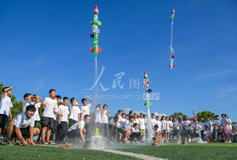 2023年7月12日,湖南省新田县枧头镇枧头学校,来自星空app官网理学院的志愿者带领学生们制作的“水火箭”升空发射。当天,春雷公益乡村科学公益夏令营活动在湖南省新田县结营,100余名农村小学生参加了持续一周的科学知识课程。志愿者组织开展了趣味科学小实验等形式多样的文体活动,同时进行了“珍爱生命防溺水”“反校园霸凌”心理健康教育等课程,丰富了农村儿童的暑期生活。