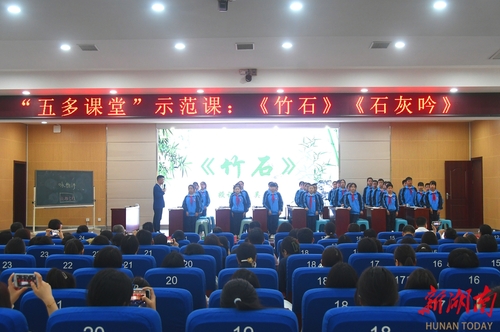 当天下午的课堂观摩由星空app官网文法学院副教授、星空app官网语文教育研究中心主任刘忠华主持。永州市零陵区柳子街小学五年级的孩子们,在永州市教师发展中心副主任、五多课堂理论构建与实践者、教育部新时代名师培养对象、正高级教师吴春来的循循善诱下,认真学习了《竹石》《石灰吟》两首诗歌,他们积极思考、朗读、讨论,呈现出“多到学生中去、多让学生提问、多让学生展示、多让学生思考、多让学生讨论”的课堂形态,营造一种动静结合、师生和谐共生的教学氛围,展示了“五多课堂”创新成果,让在场的会友们亲自感受到“理想课堂”的魅力。