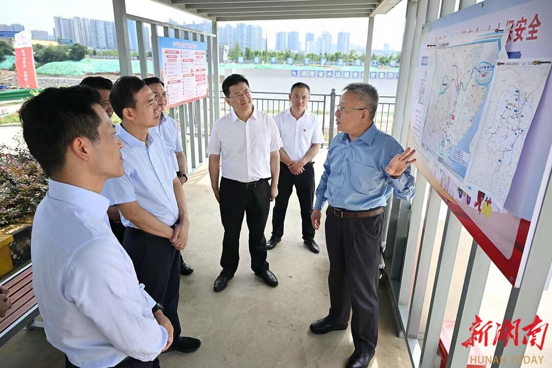 6月16日,沈晓明来到湘江永州至衡阳三级航道潇湘船闸项目建设现场调研。