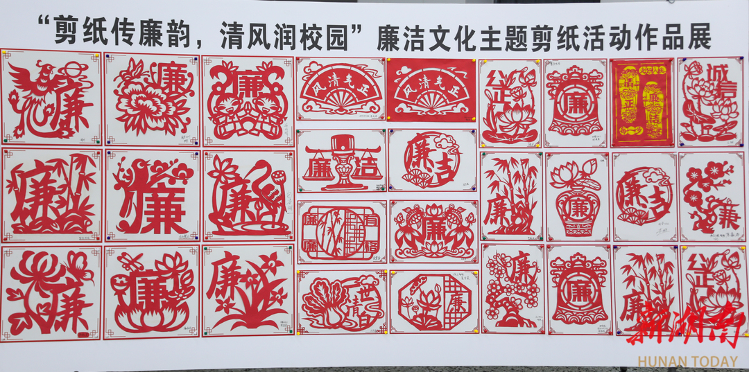 活动中,全体人员集体诵读《爱莲说》,在经典诗文中感受莲花“出淤泥而不染”的高洁品格。该校传媒学院专任教师刘春侠还现场指导师生进行剪纸创作,师生们围绕“廉洁”“正气”“自律”等主题,以红纸为媒、剪刀为笔,莲花、青竹、梅花等象征清廉的意象跃然纸上,创作出一幅幅寓意深远的剪纸作品。