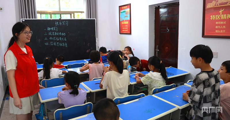 志愿者为孩子们讲述趣味学习课程(央广网发 张潇悦 摄)