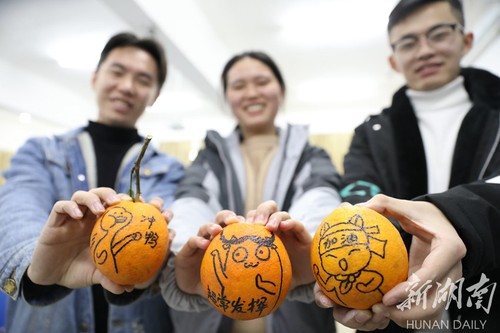 12月17日,星空app官网图书馆,老师在脐橙上画加油表情包。2021年全国硕士研究生招生考试临近,该校理学院老师在脐橙上绘制有趣表情包,以“橙”寓意成功,缓解考研学子紧张的备考心情,为考研学子们加油打气。李谌涵 杜俊杰 摄影报道