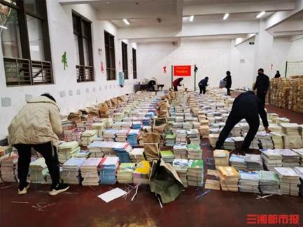 3月1日,长沙长郡双语实验中学的教师志愿者们忙着清点教材、整理课本、分发打包……该校将所有教科书和配套教辅资料为同学们快递到家,有关费用由学校承担。但三个年级3000多名学生、60500本书,需要按照每人一套进行分类整理打包,工作量巨大。在学校党委的号召下,仅仅两个小时就有55名党员教师和7名非党员老师分时段来校开展分书志愿服务。
