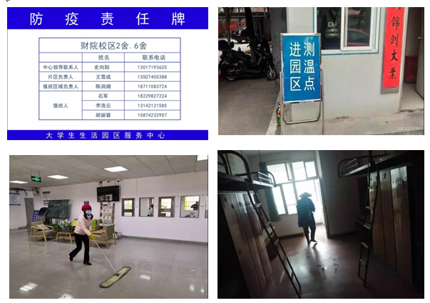 湖南大学学生园区中心加强集中统一领导、集中统一协调和集中统一调度,建立联防联控、群防群控机制,加大信息共享、工作督办,加快应急响应速度,4个工作组、120余名一线员工坚守岗位,全力守护学生平安。一是严把园区和宿舍大门关,杜绝外来人员、车辆进入园区,工作人员和留校学生测量体温并实名登记后进入园区,做到每人必检,每车必查,人人询问行程,人人测量体温,人人实名登记。二是对所有楼栋实行封闭管理,留校学生严格进出、每日测量体温并做好实名制登记。三是每日做好楼栋通风透气,对楼栋内外公共区域进行全面消毒,建立电梯、洗衣机、门禁等公共设施消毒台账,设置废旧口罩回收点并消毒,加大供电、供水、空调等设备设施的巡检力度,严格按要求使用和保管消毒液和医用酒精。