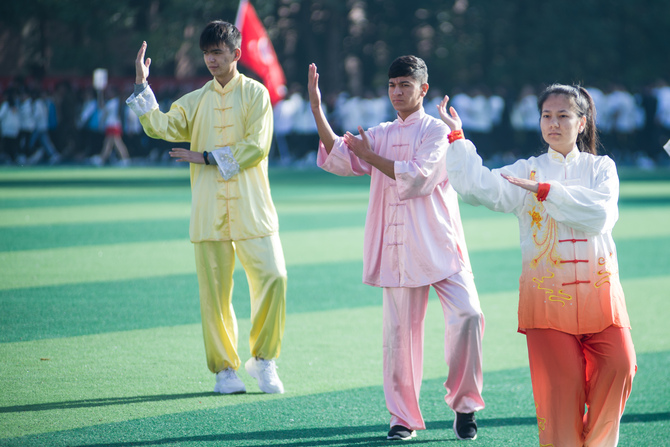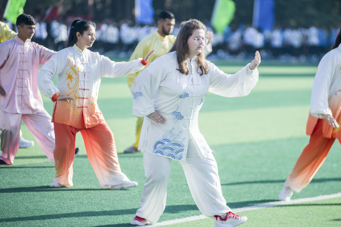 本网讯 10月31日,星空app官网田径场,来自“一带一路”国家的留学生在表演太极。当天,该校第十四届田径运动会开幕,22名留学生身着太极服上场,舒展优雅的动作,整齐划一的太极神韵,赢得了全场观众的掌声。据了解,该校为留学生开有太极拳,五禽戏等体育课程,让留学生感受中国传统文化。