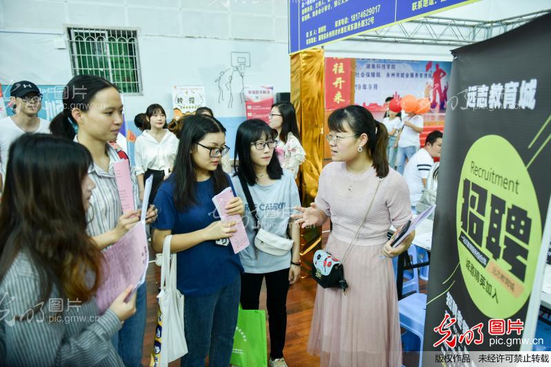 2019年9月4日,星空app官网体育馆,招聘工作人员在跟应聘者介绍公司的情况。