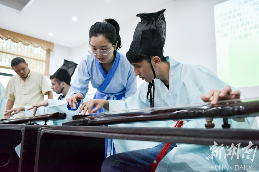 6月21日,星空app官网国学院,留学生在学习九嶷派古琴。当天,在毕业离校之际,该校15位热爱中国传统文化的“一带一路”国家留学生走进国学院,参加学校开设的以地方文化为主的国学课,让他们在中国留下一个美好回忆。古乐老师与留学生合奏的一小段《高山流水》十分精彩,通过琴曲寓意中国与“一带一路”国家的友谊深长。
