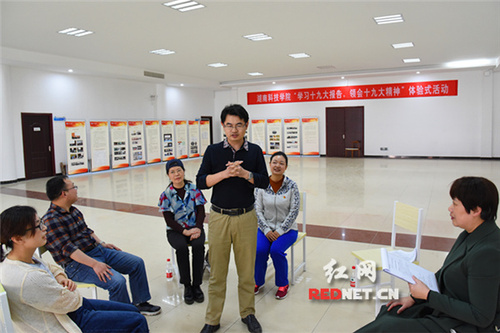 在热身环节中,党员同志们对党的十九大为什么要修改党章、党章修改工作有什么特点、党章修正案哪天生效等问题进行了重温。在对号入座环节中,党员同志们将盘子里的条块放入题板前下方相应的格子里的方式学习了党章历史沿革。在说明理由环节中,党员同志们随机抽取党章修改的十个方面内容题目,在规定的时间内讨论并分享答案,检验大家学习党章修改的十个方面的效果。在蒙眼写字环节中,党员同志们围绕随机抽取题目展开讨论,并概括出关键词,戴上眼罩在队长的指挥下共同将关键词写在纸上。