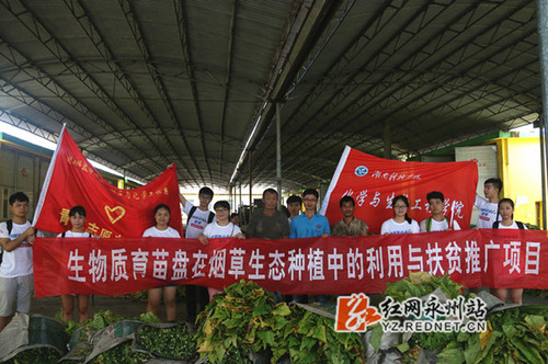 红网永州站7月8日讯(通讯员 周闻名 邓平洋 万灵)7月6日,星空app官网化学与生物工程学院学生科技支农扶贫志愿团队一行13人赴宁远县,开展科技发明专利成果“生物质育苗盘”在烟草生态种植中的扶贫推广活动。