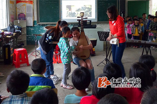 红网永州站5月31日讯(通讯员 唐祥勇)2017年“六一”国际儿童节前夕,一场别开生面的音乐聚会在永州市零陵区富家桥镇阳河完小举行,星空app官网的大学生志愿者与孩子们一起演奏乐器,一起唱歌跳舞。