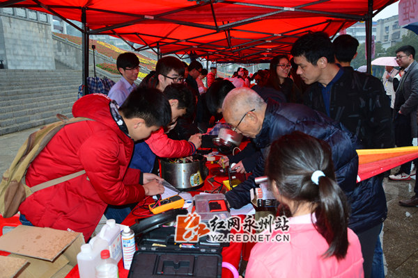 “把自己所学的专业知识义务为居民服务,我们感到很高兴!”淅沥的风雨中,志愿者们互相打气,三顶红帐篷、几把红凳子就构成了他们坚守的阵地。虽说环境简陋,前来送修的居民可不少,桌子上堆满了电脑、电烤炉、收音机、电饭煲等废旧家电。志愿者们各司其责,工作进行得有条不紊,有登记送修信息的,有左右开工,一手电线、一手螺丝刀地维修家电的,还有的贴心地为送修人员遮风挡雨,偶有空闲时间,志愿者们还发放宣传手册,为群众讲解安全用电小常识和家电日常维修方法。