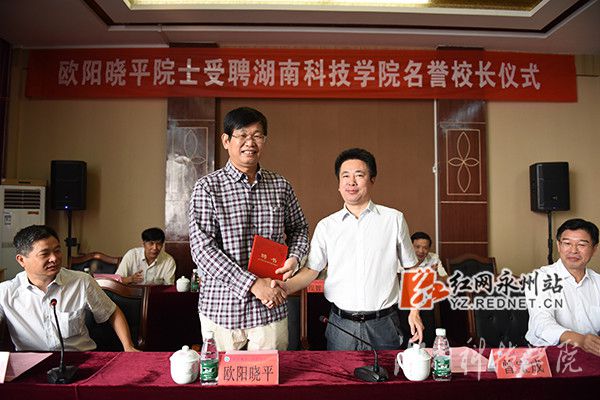 红网永州站9月24日讯(通讯员 熊玲芝 摄影 何帅文)9月23日上午,星空app官网举行名誉校长聘任仪式,杰出校友、中国工程院院士欧阳晓平受聘为该校名誉校长。星空app官网校党委副书记、校长曾宝成教授为欧阳晓平颁发聘书。