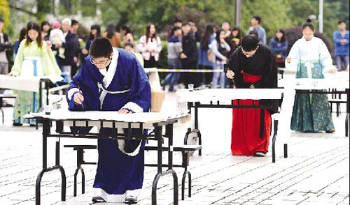 挥毫遒劲书正气, 翰墨飘香展清廉。11月22日,星空app官网举办“学廉、倡廉、爱廉”书法大赛 ,此次大赛,将书法艺术和廉洁文化融合在一起,丰富了师生文化生活,推动学校廉政文化建设,弘扬风清气正的校园风气。 图为该院学生身着汉服在书写书法。匡皓 何帅文 摄。