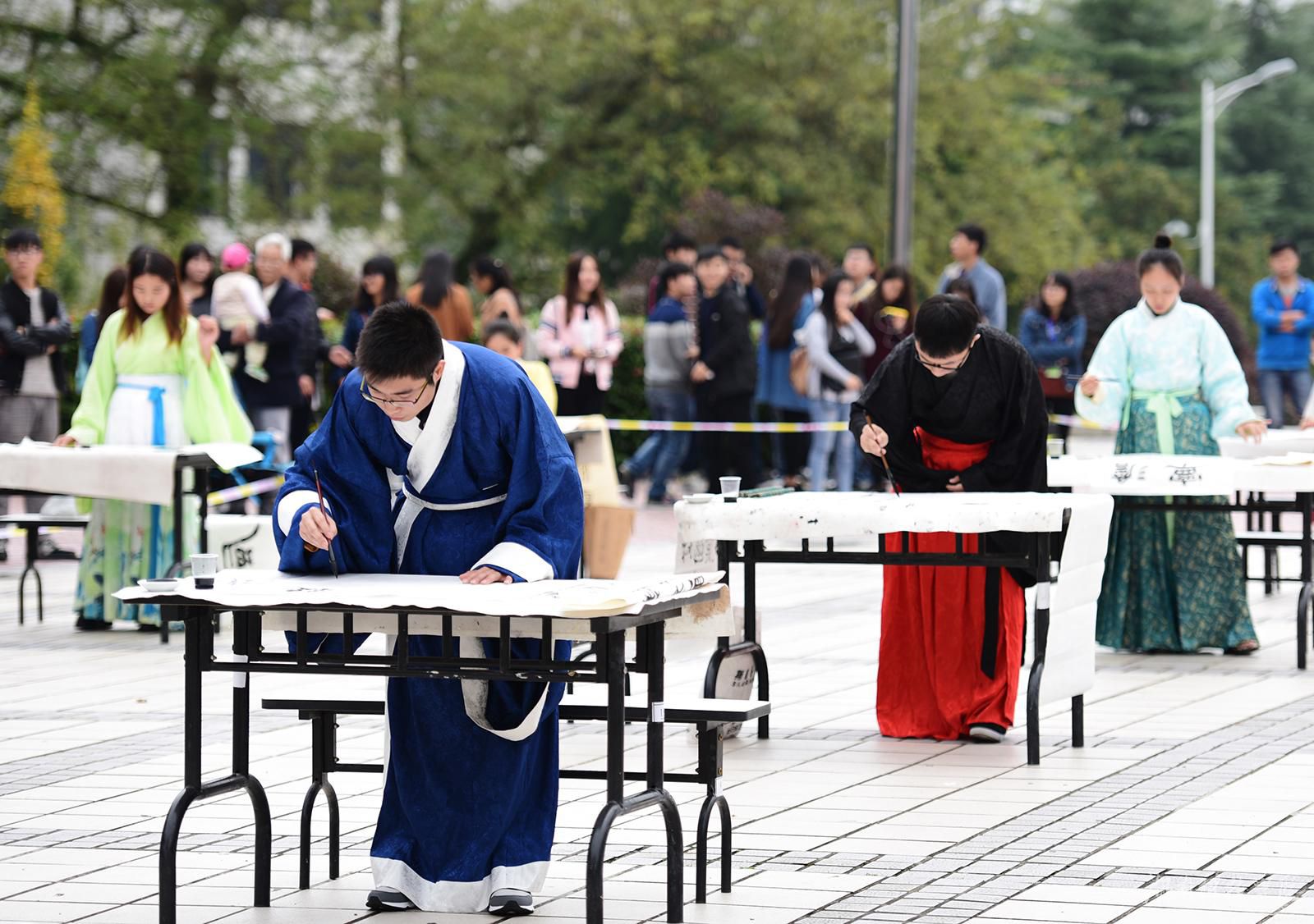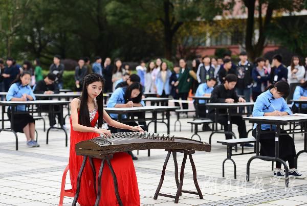 该校在文化广场举行现场书法大赛,硬笔组学生着民国服装,软笔组学生着汉服,为现场观众完美展示了书法的笔精墨妙。伴随着轻柔舒缓的古筝乐声响起,太极拳表演者以抱拳动作起势,把中国博大精深的传统文化与艺术之美巧妙融合,展示了无与伦比的人文艺术之美。