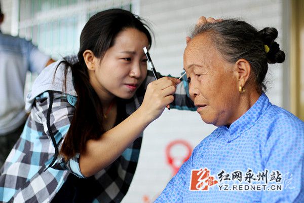 团队成员为老人化妆