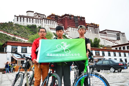 在22天的时间内,该校自行车协会三名成员王煜、李东、杨华从成都骑行到拉萨。王煜说:“每个人的心中都藏着一个西藏梦,旅行就是为了遇到最真实的自己,我想这就是我们团队骑行西藏的初衷。” 在怒江遇到塌方,飞石砸伤了他的脚;下坡急转弯,队员险些坠到山坡下;高山飞雪冷风凛冽,骑友们手脚失去知觉仍然拼命蹬着踏板,在种种苦难的考验下,他们坚持下来了。在这二十多天内,他们承受着四季的剧烈变化,体验到困境的无奈,暴晒,大雨,冰雹,饥饿,感冒,高原反应,险恶的境况并没有阻止他们前行的脚步,反而让三人与其他骑友汇聚新的团队,同甘共苦、同舟共济加快前进的速度。“一个人能骑得很快,但一个团队能骑得更远”这是他们的口号,也是他们炽热的誓言,当他们站在布达拉宫下拍照留念时,他们热泪盈眶地拥抱在一起。“一个人的力量是有限的,是整个团队的力量让我们到达了梦想的殿堂。”王煜说道。